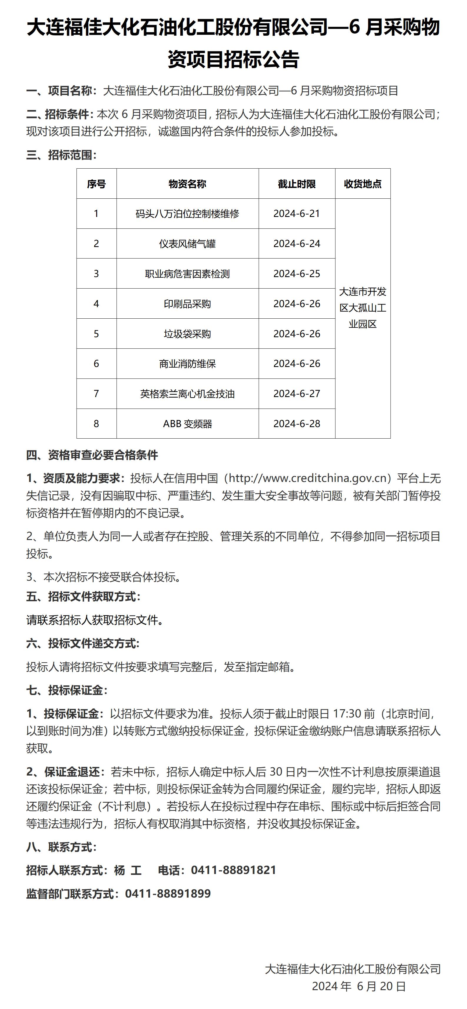 大连福佳大化石油化工股份有限公司—6月采购物资项目招标公告|福佳集团-凯发娱乐