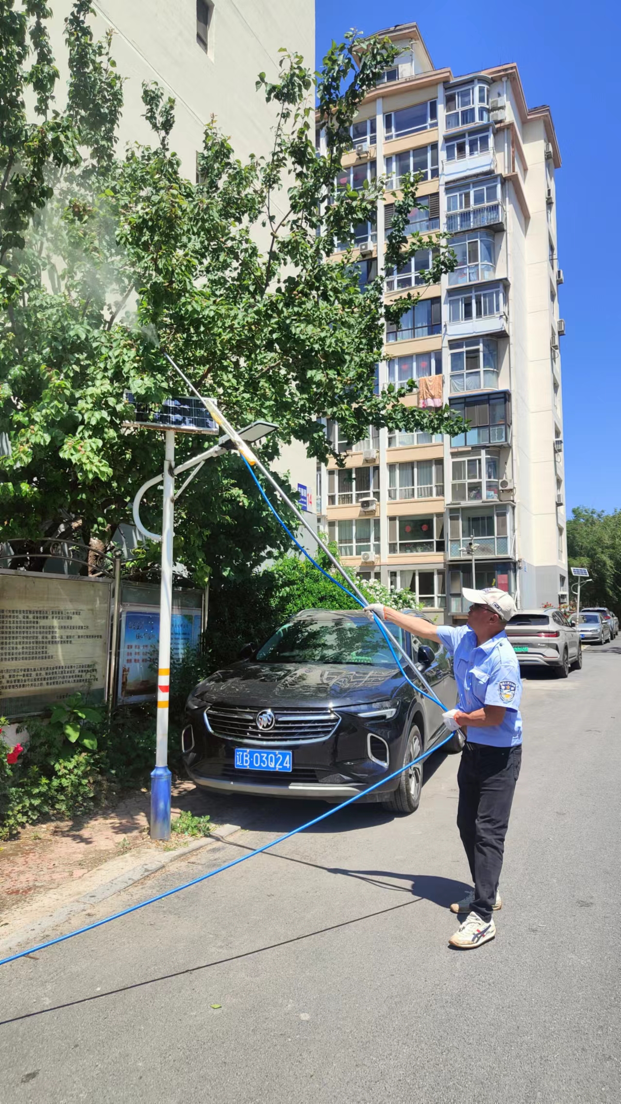 随着夏日气温的逐步升高,各类虫害也日渐增多,为了保护苗木不受虫害所影响,物业准备了环保安全的消杀药物和专业的喷洒设备,全方位无死角的对园区害虫进行消杀,确保植被的健康生长。