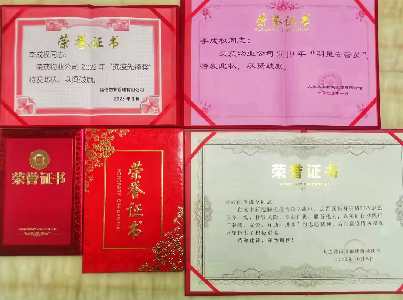 (李成权:福佳新城abd区物业安管主管,曾带领团队获得物业公司安管专业技能比赛2016年度第一名、2017年年度第三名、2022年度第二名,个人获得物业公司2019年度明星安管凯发娱乐的荣誉证书,2020年、2022年两次获得街道颁发的凯发娱乐的荣誉证书。)