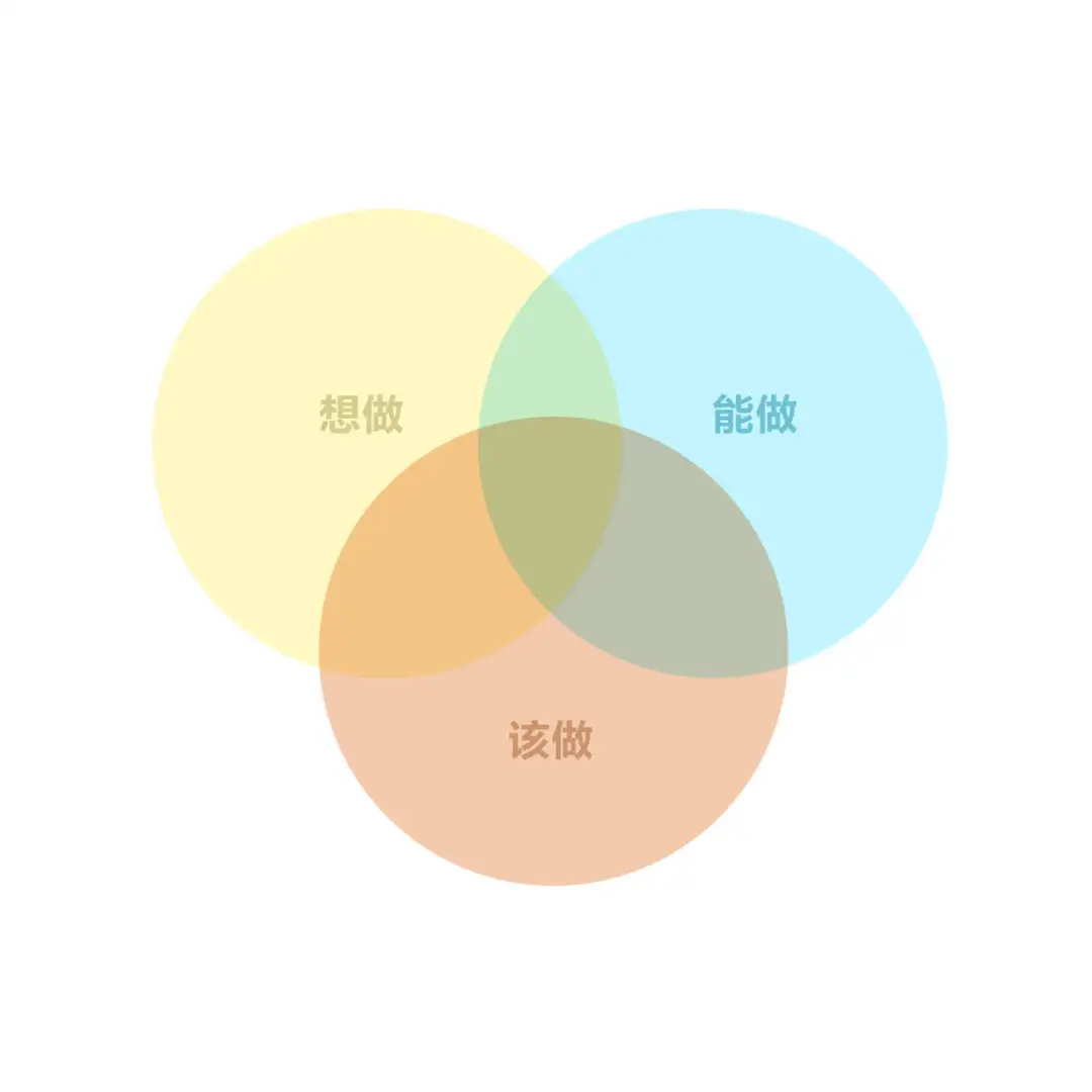 你还可以按自己的想法将事务进行整理。有一个著名的“三圈模型训练”是这样的:画出彼此相交的三个圆圈,分别标注“想做”“能做”“该做”,将手头的事情进行归类,最后处在三圈交点区域的事情,就是当下最重要的事。