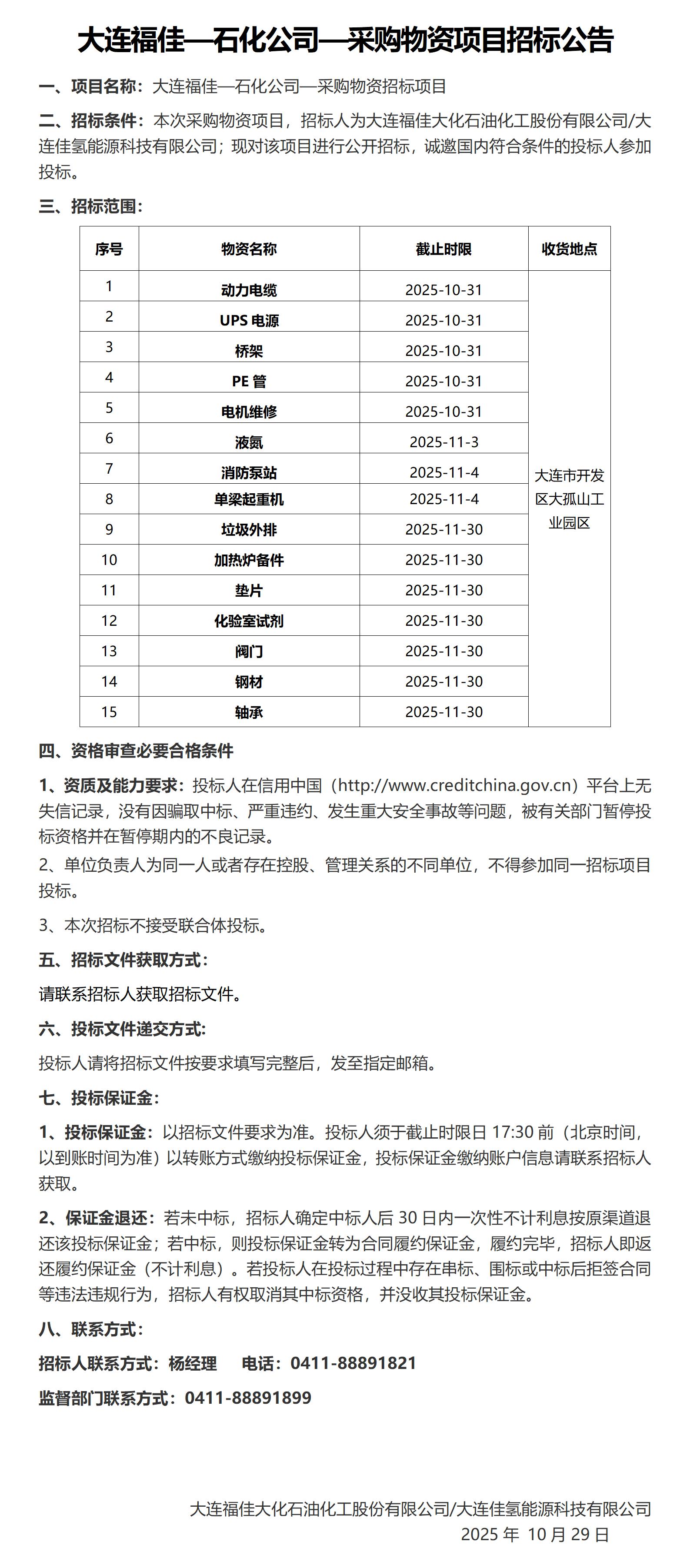 大连福佳大化石油化工股份有限公司—11月采购物资项目招标公告|福佳集团-凯发娱乐